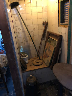 We vonden het pand erg leuk en we raakten aan de praat met de antiekhandelaar die net wat handel uit zijn winkel buiten aan het uitstallen was (het gelige gebouw). We zeiden dat we deze huizen zo leuk vonden en hij raadde ons aan even binnen te kijken omdat we dan zouden kunnen zien hoe het huis er vroeger uit had gezien. Het bleek een antiekwinkel in een antiek pand te zijn. Met ontzettend veel oude zooi. Zelfs Margreet, die niet vies is van antiek, kon nergens echt warm voor lopen; het was gewoon te veel en te oud. Maar het pand vonden we ontzettend leuk. De vloer had nog zoveel mogelijk originele tegels en de keuken en de wc waren eeuwenoud;